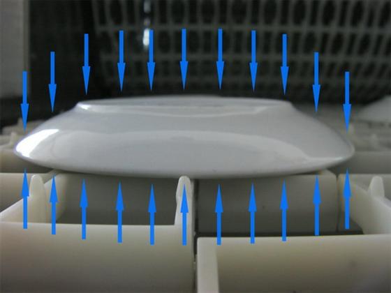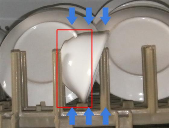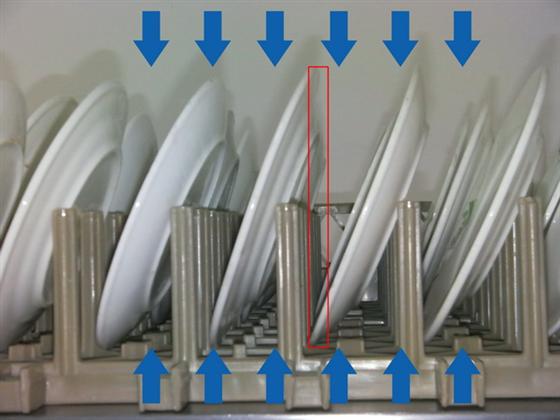 最關鍵的是斜插式的洗碗機傳送,在洗碗機清洗過程中存在較大的弊端,斜插于籃筐(傳送帶)上會因為其本身的形狀造成一個清洗死角,導致餐具清洗不干凈。如下圖示。所以在業(yè)內不公開的秘密,因清洗質量存在缺陷,用在不太重要的客戶場所,象重要的機關、大型學院、合資公司、高級酒店等已逐步不再采用。